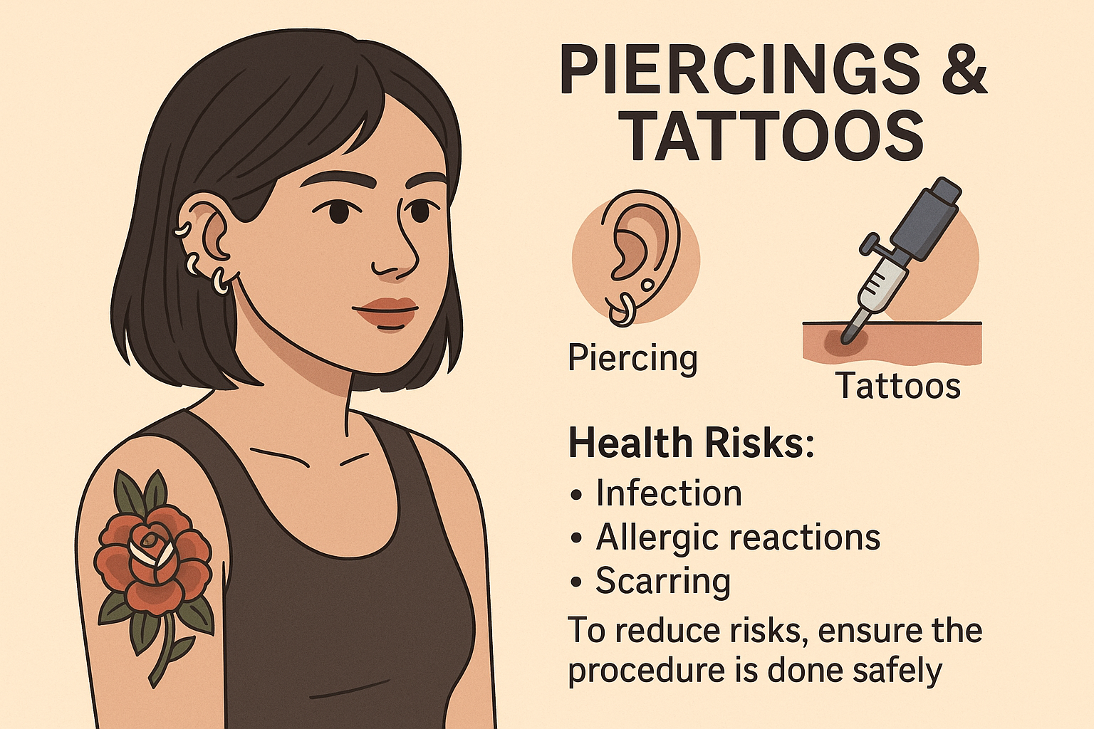 Piercings and tattoos are body decorations that go back to ancient times. Body piercing involves making a hole in the skin so that you can insert jewelry. This is often in the earlobe, but can be in other parts of the body. Tattoos are designs on the skin made with needles and colored ink. A permanent tattoo is meant to last forever. Permanent makeup is a type of tattoo.